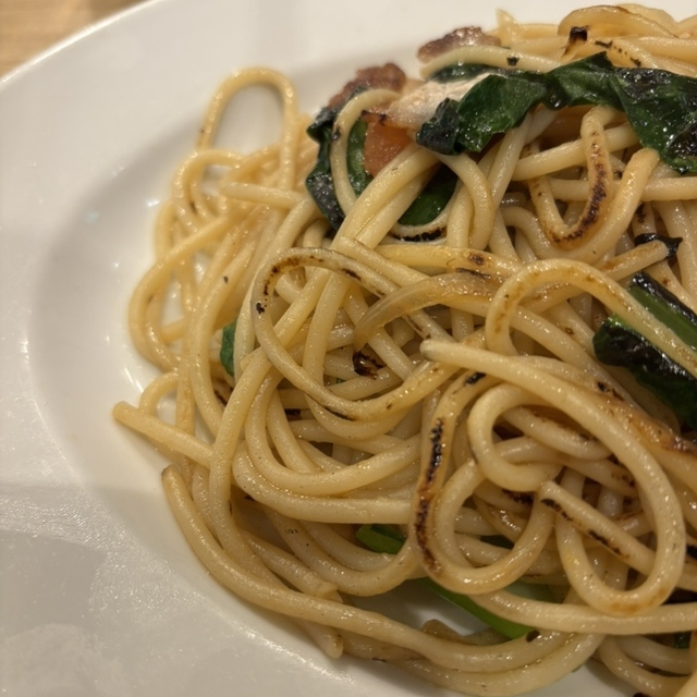 モチモチの太麺パスタに醤油系の味付けが絡み、フォークではなくお箸でズルズルと頂きたくなるようなテイスト。