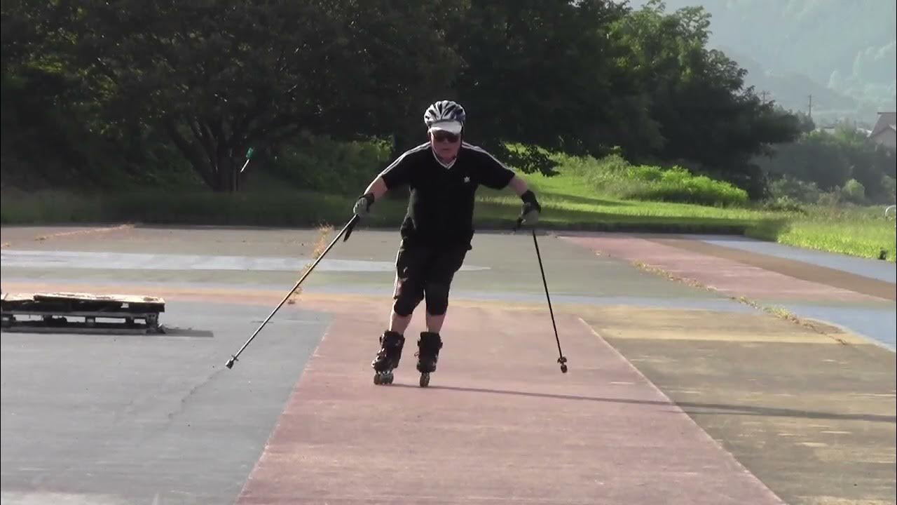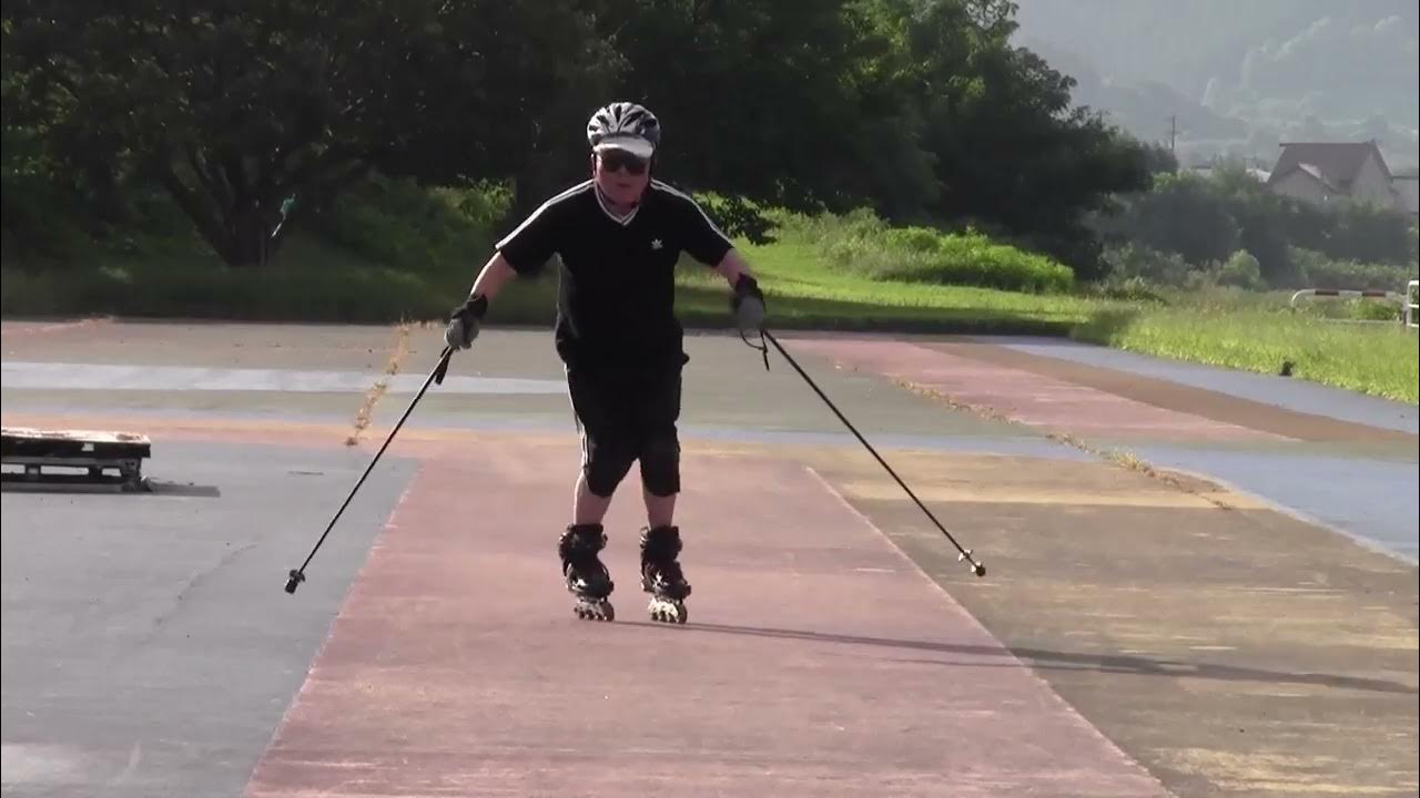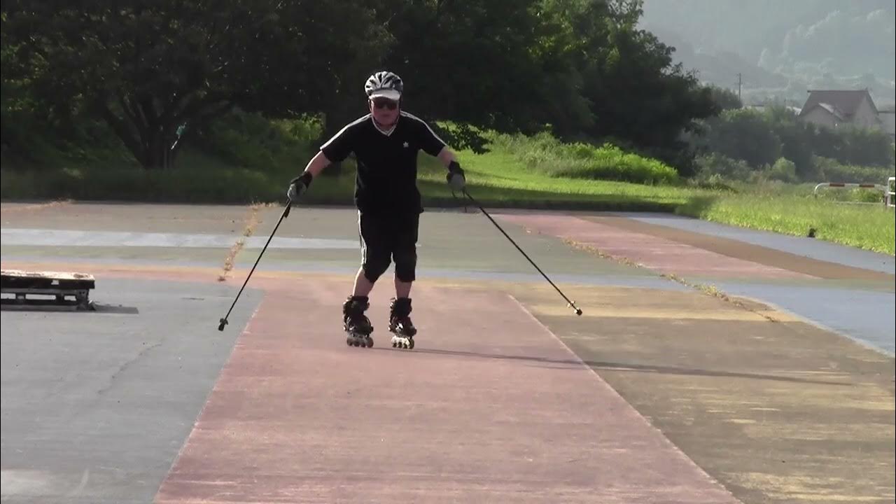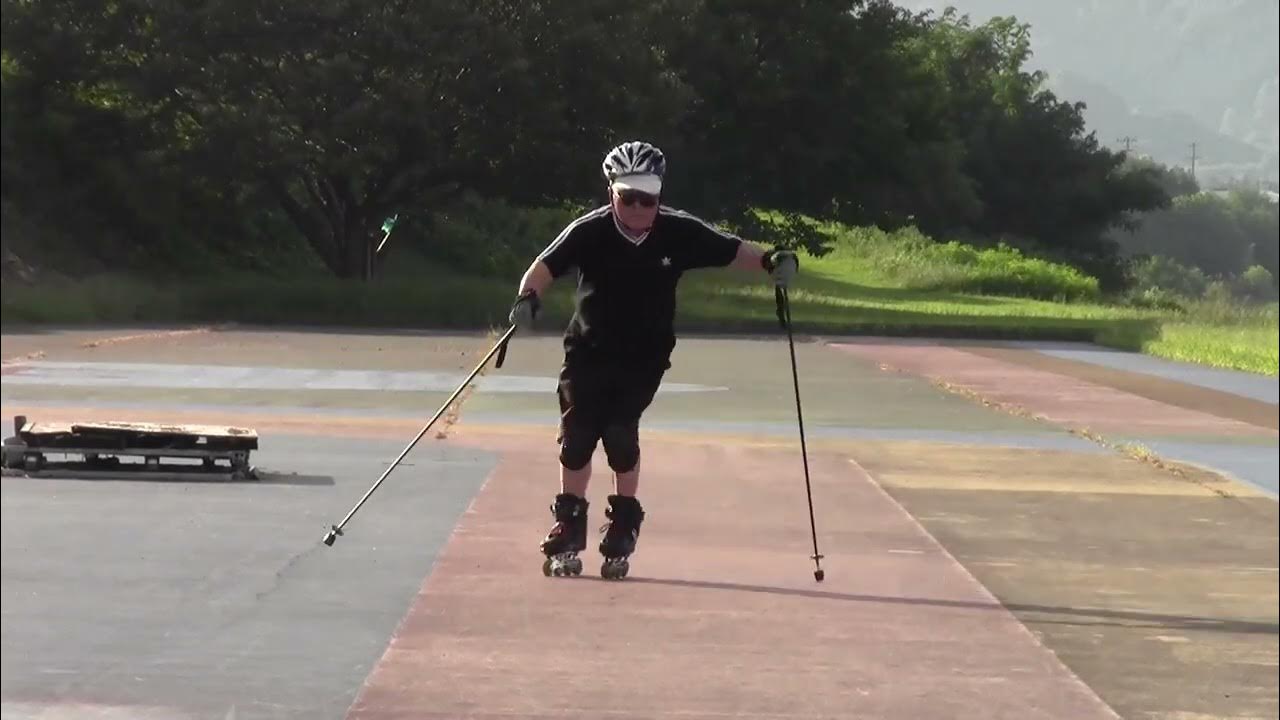 早朝インラインに来たらエルボーガード忘れてきたことに気付き、後方に転倒すると危ないのでストック持ってスキーの真似事してみました。