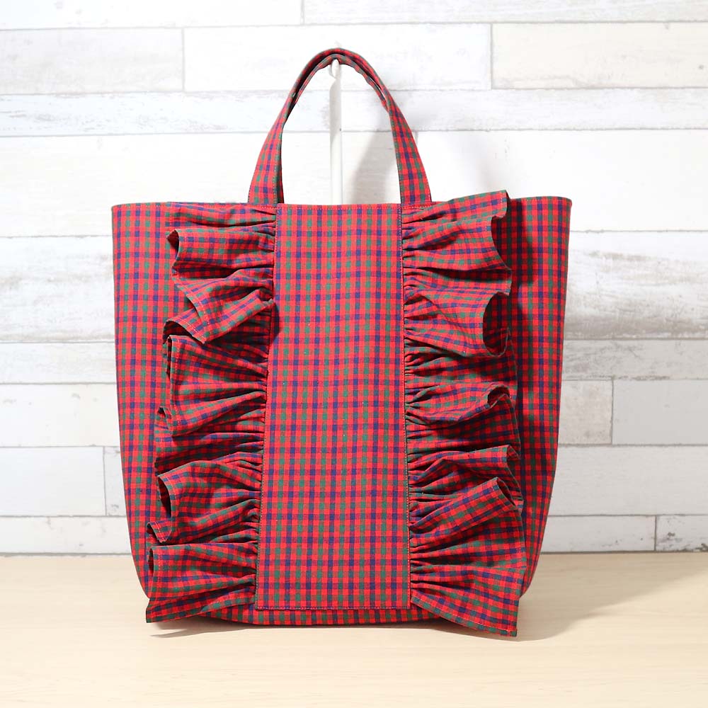 フリル付き 赤ェック マチあり ポケット付き トートバッグ 通勤バッグ A4対応 サブバッグ タータンチェック サブバッグ 大人ナチュラル 上品かわいい お出かけにも便利 『ハンドメイドバッグ』『ハンドメイド作品』楽天市場