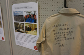 一角には、東日本大震災に遭われた地域へ支援に行った市職員の方々の写真や、岩手県山田町長のメッセージが記された作業着が展示されていました。