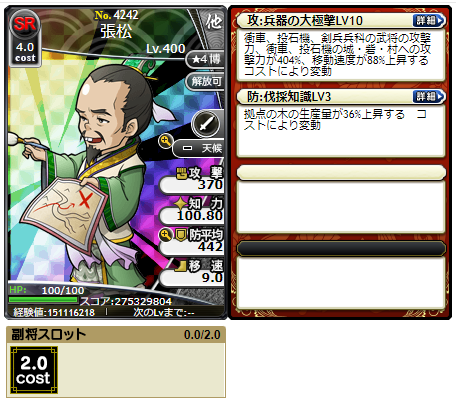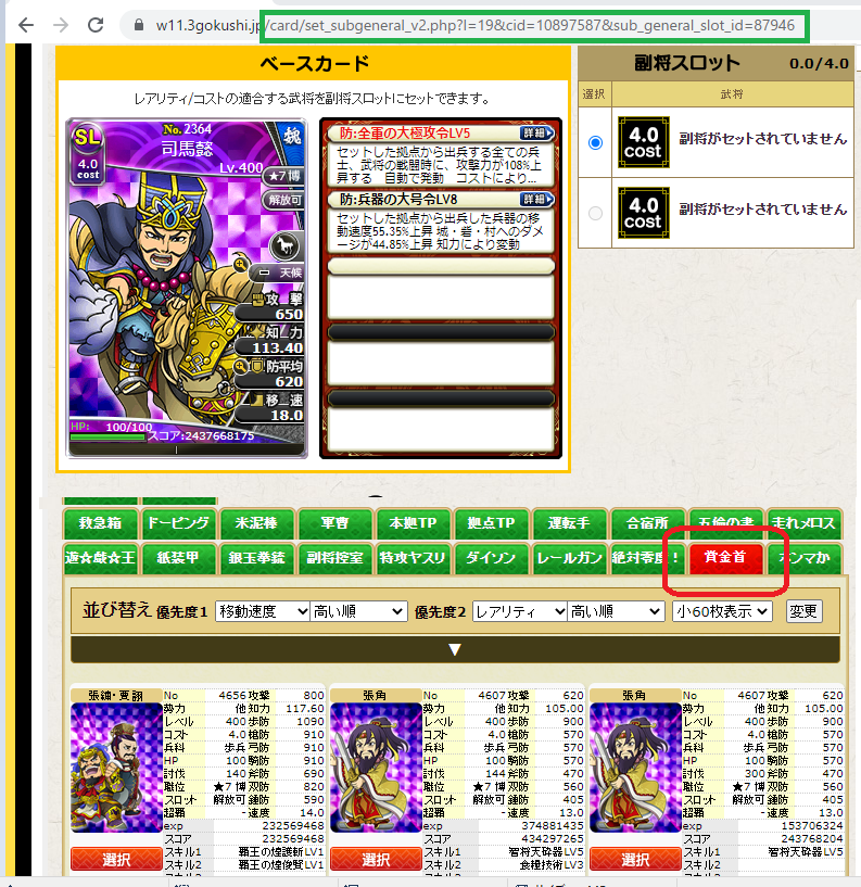 使用するカードはSL司馬懿、副将に入れるのはSL張繍・賈詡