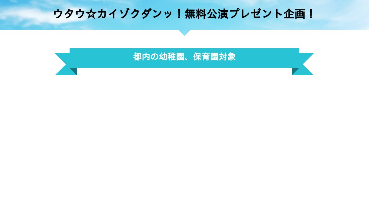 ウタウ☆カイゾクダンッ!都内公演プレゼント企画2025年に結成20周年を迎えたウタウ☆カイゾクダンッ!感謝の気持ちを込めまして、公演を無料プレゼントいたします。今回の対象は、東京都内の幼稚園、保育園 10ヶ所となります。9ejd7.hp.peraichi.com
