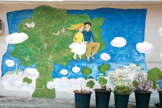 花が満開の石畳の階段から翼を広げて舞い上がる鳥、愛し合う恋人たちの恥ずかしそうな笑顔など、狭い路地を通り過ぎるたびに新しい作品を見つける楽しみがある。