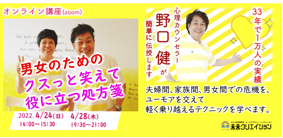 夫婦間、家族間、男女間での危機を、ユーモアを交えて軽く乗り越えるテクニックをお教えします。