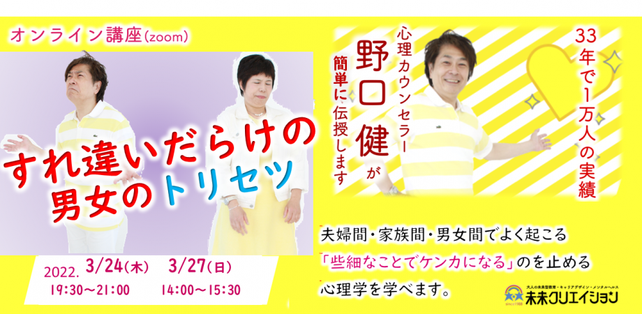 夫婦間、家族間、男女間での危機を、ユーモアを交えて軽く乗り越えるテクニックをお教えします。