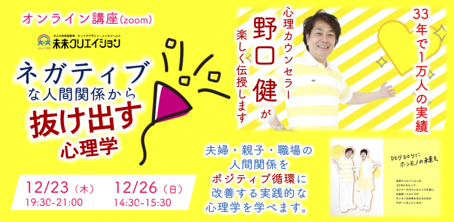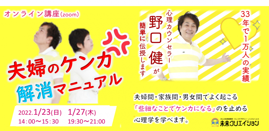 34年間に1万人のカウンセリング、心理カウンセラー野口健・野口ひとみの90分オンライン心理学講座は、