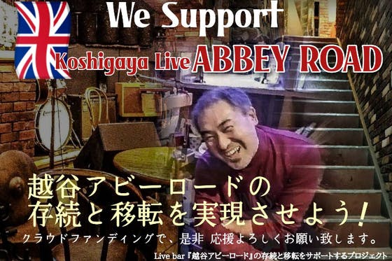 LIVE BAR『越谷ABBEY ROAD』の存続と移転を支援するプロジェクト長きに渡り埼玉県越谷市の音楽シーンを支えてきた越谷ABBEY ROADが、今年6月に入居ビルの老朽化による取り壊しのために移転を余儀なくされます。コロナ禍で厳しい中でもライブ演奏の場を提供し続けてくれた素敵なお店をぜひとも残したい。そんな強い想いのメンバーが集結してこのプロジェクトを立ち上げました!camp-fire.jp