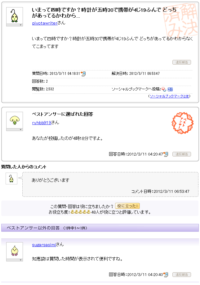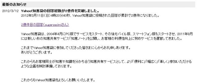 2012年3月11日(日)4時20分40秒、Yahoo!知恵袋に投稿された回答が累計で2億件になりました