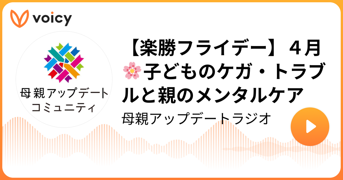 【楽勝フライデー】4月🌸子どものケガ・トラブルと親のメンタルケア | 母親アップデートコミュニティ(HUC)「母親アップデートラジオ」/ Voicy - 音声プラットフォーム音声放送チャンネル「母親アップデートコミュニティ(HUC)」の「【楽勝フライデー】4月🌸子どものケガ・トラブルと親のメンタルケア(2024年4月19日放送)」。Voicy - 音声プラットフォームvoicy.jp