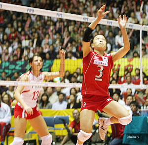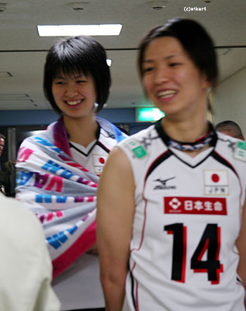 今日の写真はまた後程。宝来のブロックシーン、杉山と宝来が並んでストレッチしてるとことか、シン・さおりん・トルコ選手のサーブシーンなど。