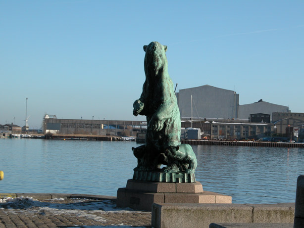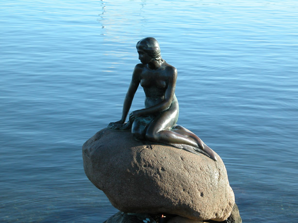 あわてて追いかけて10分ほど行くと、お揃いの真っ赤な(ややあか抜けない)上着を着た一団がバスから降りてくるのに出くわす。デンマークにもなにやら団体さんのツアーがあるらしい。今度は奥さんの方が振り返り、前方を指さす。そのまま進むと、川縁に出る。川岸にいくつか岩があり、その一つの上にちょっと猫背気味の人魚がてん、とのっかっていた。