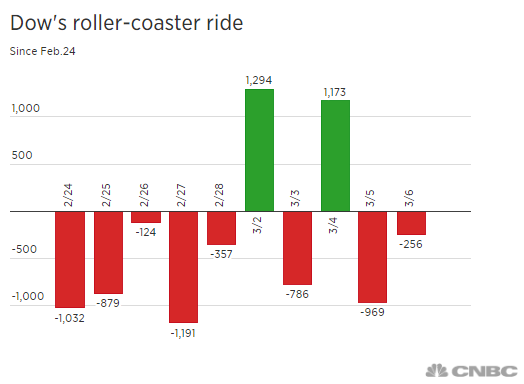 I sank the entire sum into 8 different ETFs. Fintech, software, semiconductor, aerospace & defence, gold, one pretty well-performing active fund and two general index funds. I think they were bought shortly after the market opened on 3/4, when Dow was at about 26,450 points. I derived that based on the purchase price of my various equities, but it should be accurate to -/+ 50. The following two days the market crashed... and crashed again. When the market closed on 3/4, I was at +$1200 gains, and the next day I was at -$200 losses, and -$1400 when the market closed on Friday. All of my equities fell around 3%; one fell 5.40%.