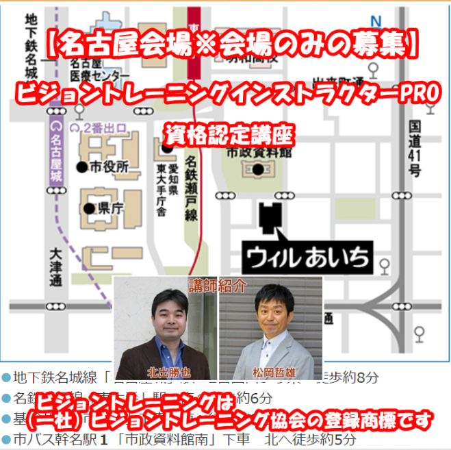 名古屋ビジョントレーニングインストラクターPro講座のご案内 【名古屋会場※会場のみの募集】ビジョントレーニングⓇインストラクターPRO(プロフェッショナル)資格認定講座 2024年8月17日〜2024年8月18日(愛知県) - こくちーずプロ【名古屋会場※会場のみの募集】ビジョントレーニングⓇインストラクターPRO(プロフェッショナル)資格認定講座 2024年8月17日〜2024年8月18日(愛知県): 「キッズビジョン®」・「ビジョントレーニング®」などの商標権を保有している一般社団法人ビジョントレーニング協会公認の資格認定講座です。 - こくちーずプロを使えば、驚くほど簡単で安全なイベントの…www.kokuchpro.com 夏休み 8月17日18日 名古屋 ビジョントレーニングインストラクターPro講座のご案内になります。 どうぞ、よろしくお願いいたします。