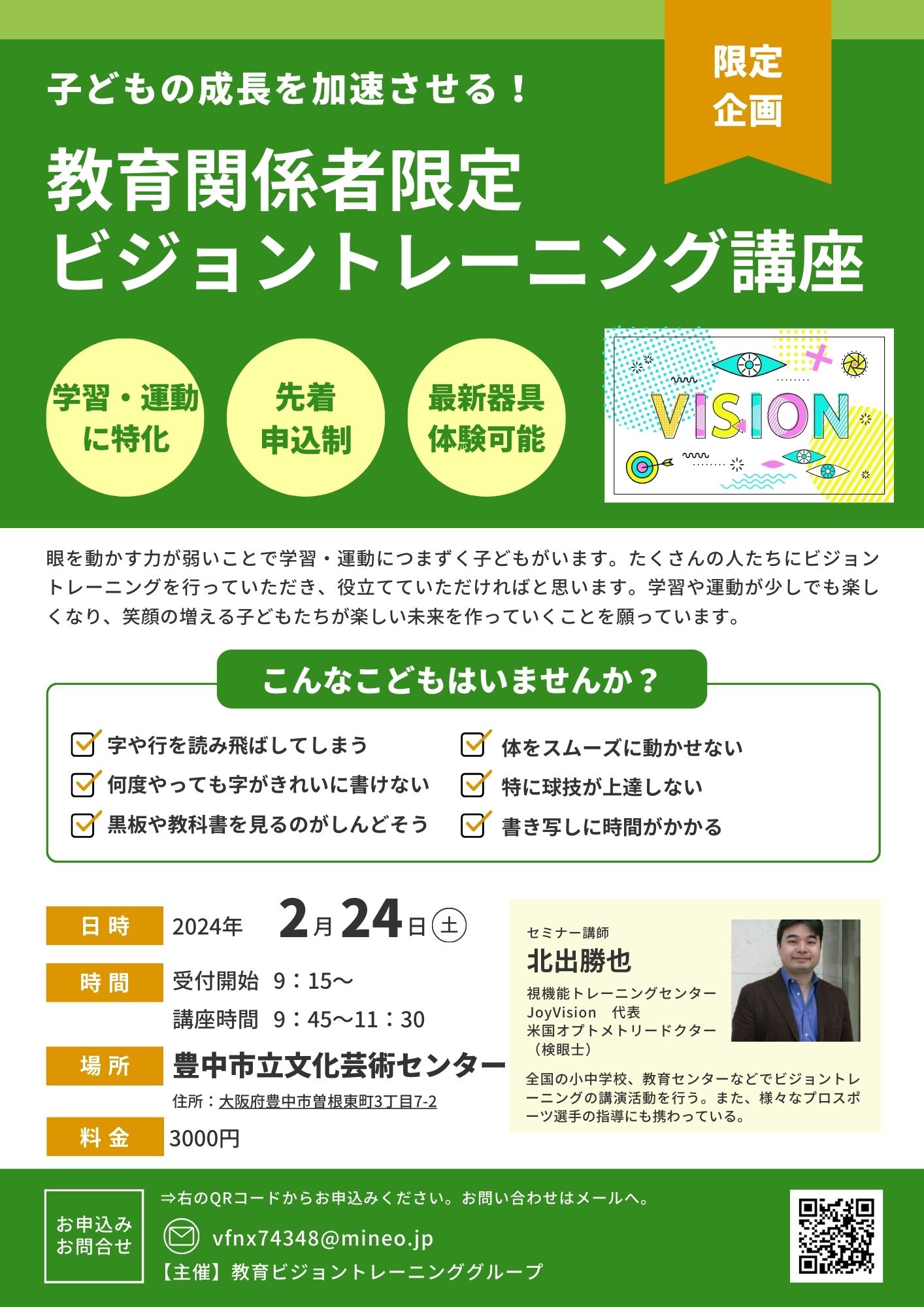 教師向けセミナーのご案内です。2023年2月24日 教師向けセミナーのご案内になります。 子どもの成長が加速する!教育ビジョントレーニング講座 - 大阪府 豊中市曽根東町3-7-2 /2024年2月24日09:15〜11:30全国の研究会・勉強会・セミナーの情報を一つに集約。イベント掲載数は総計12000件以上。senseiportal.com どうぞ、よろしくお願いいたします!