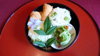 5)豆ごはん、だし香るふっくら稲荷、即席白菜漬け