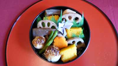 3)”だし名人”で煮含めた蓮根・こんにゃく・南京・小芋・人参・いんげん各炊き合わせ