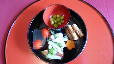 純あまトマトのゼリーキューブ、たたきごぼう、塩えんどう