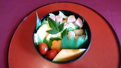 1)刺身イカとオクラのゼリー寄せ (ゼリーを型からはずす湯煎の温度50°cで時間6秒)