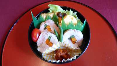 2)ロールチキンのサム醤添え、ふわふわ食感の揚げかまぼこの肉みそ添え