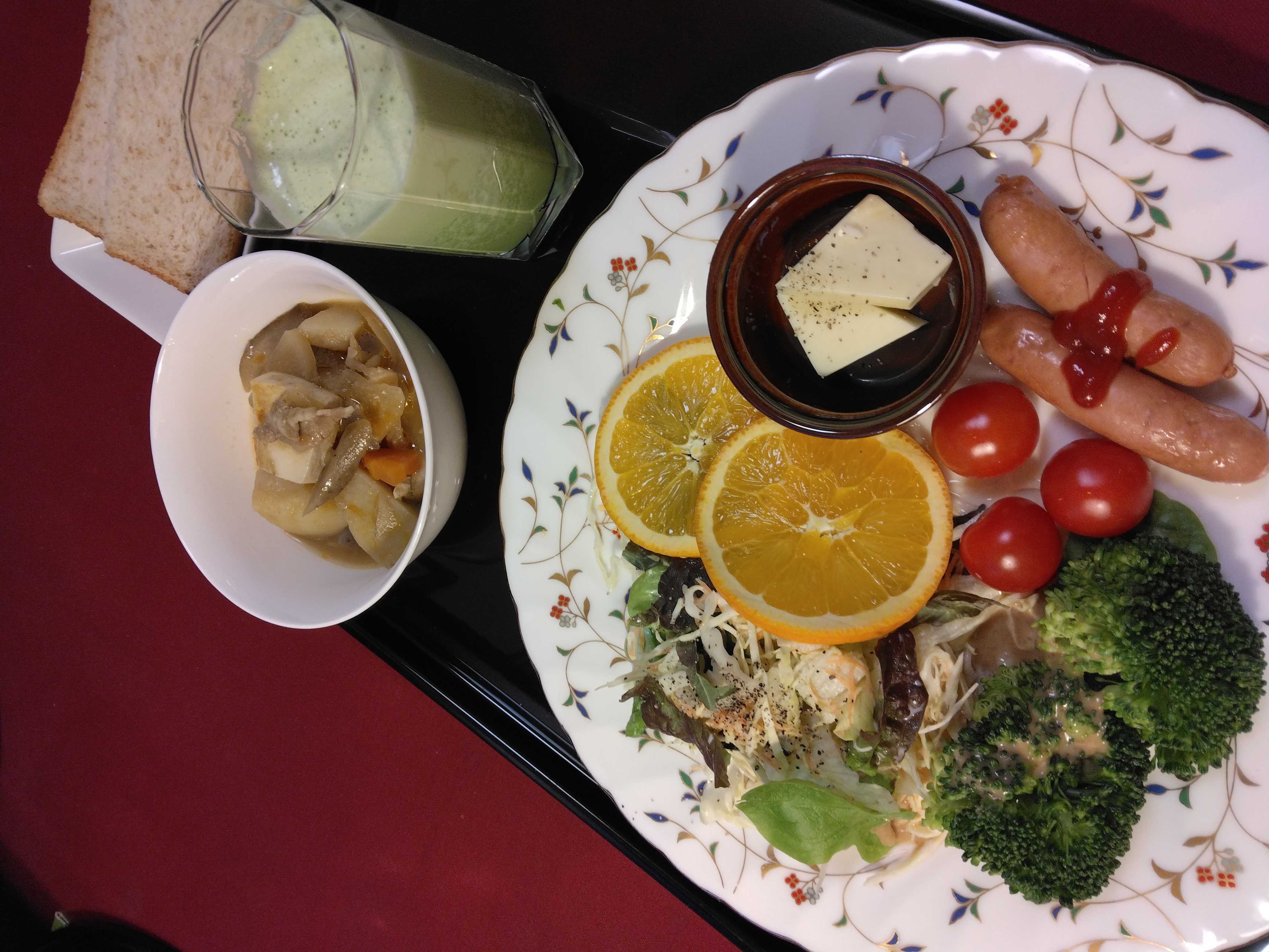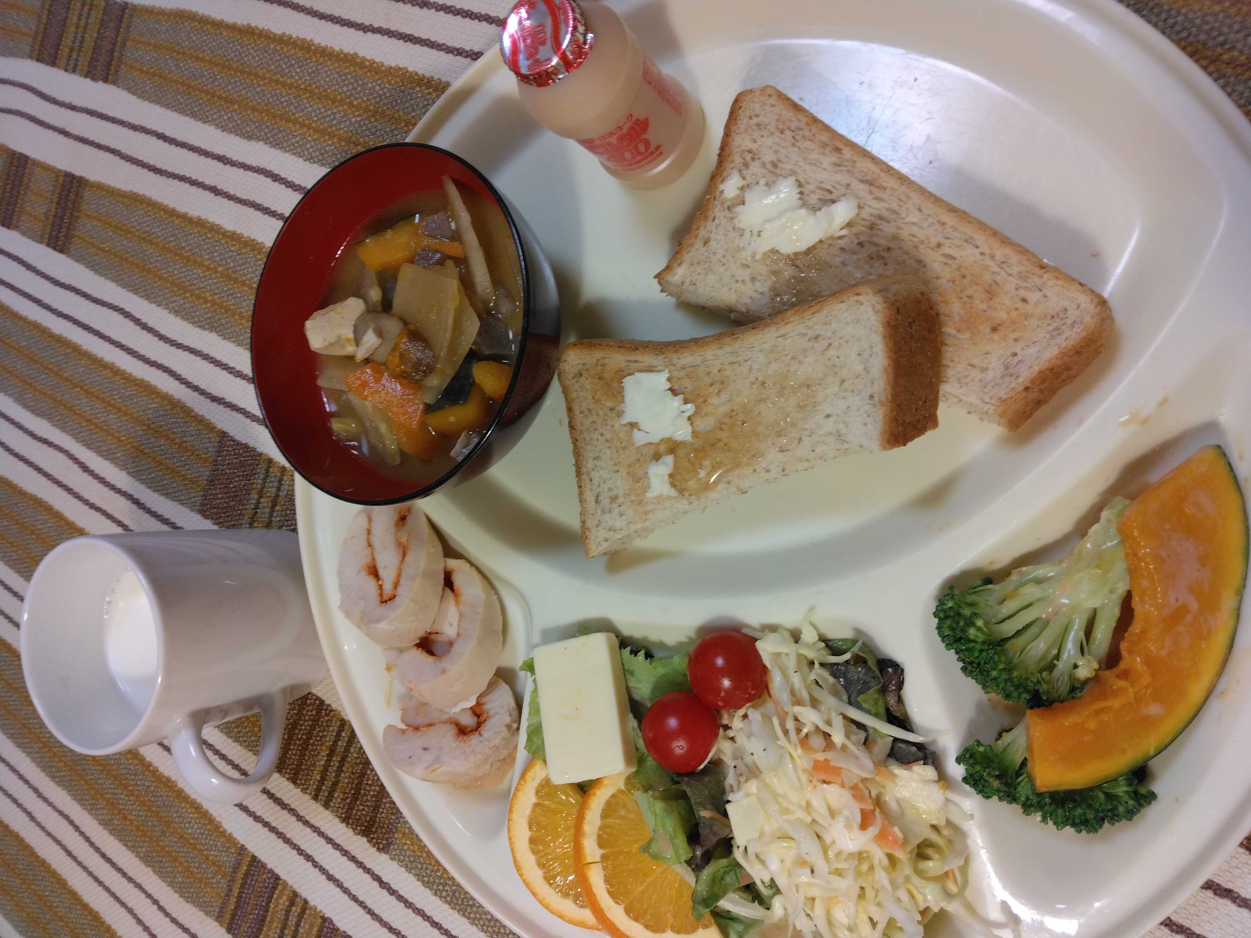 法蓮草と牛乳のスムージー、具だくさんの豚汁、コールスロー、ブロッコリー、オレンジ、ミニトマト、鉄分入りチーズ、全粒粉パン、ヨーグルト、ブルーベリージャム、ゆず果汁入りゴマドレッシング