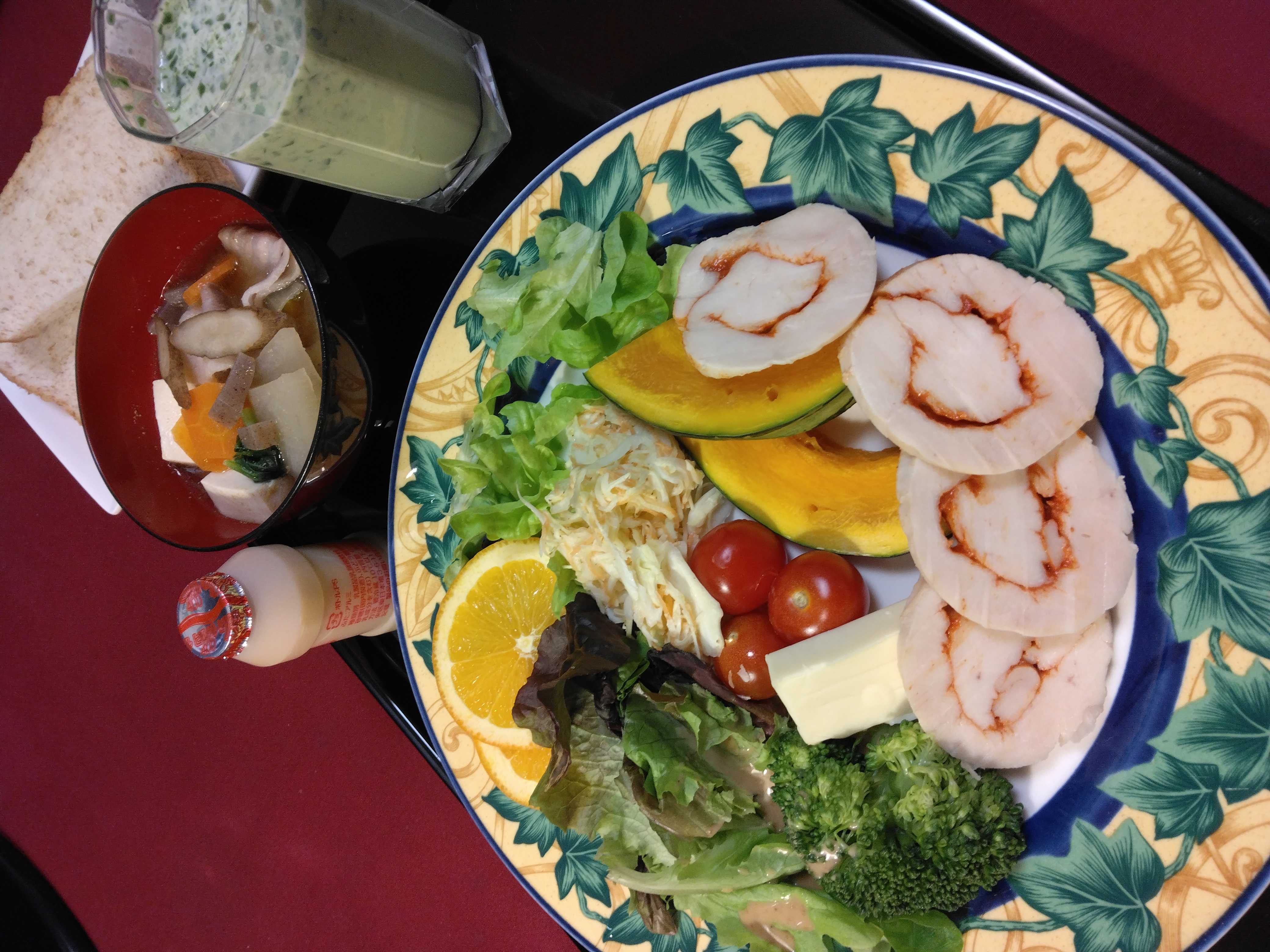 2日目は、コチュジャン・ロールの鶏ハムと蒸し南瓜が登場、他は初日と同じ。