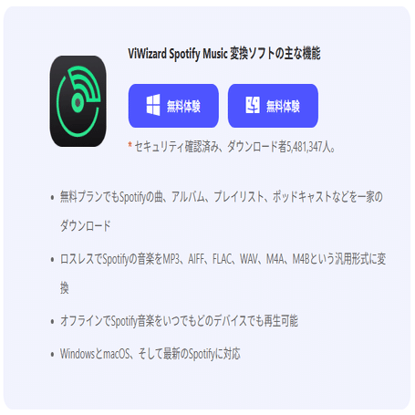 そんな方には「ViWizard Spotify Music 変換ソフト」がオススメです。これを使えば、Spotifyの曲やプレイリストをPCにダウンロードし、MP3などに変換可能。ネット環境なしでも再生でき、好きなデバイスで音楽を自由に楽しめます。