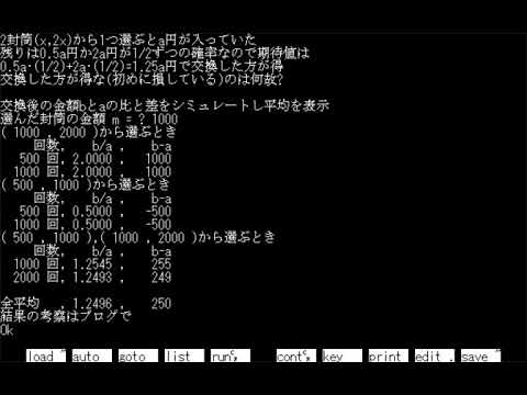 160 PRINT "2封筒(x,2x)から1つ選ぶとa円が入っていた"