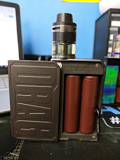 It uses two 18650s that go in side-by-side like your traditional dual battery mods. The display shows your wattage, coil resistance, voltage (when firing) and a single battery indicator with 5 bars.
