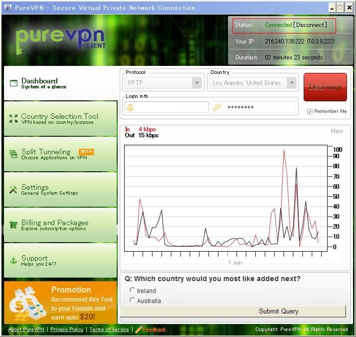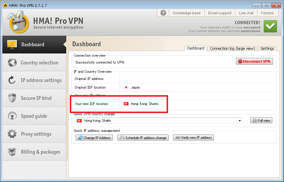 IDとパスワードが正しければ、接続することができます。”Your new ISP location(新サーバの地域)”が接続先になります。下記の画像では、日本に接続していることになります。