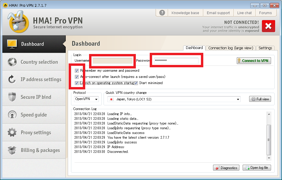 起動するとID(Username)とパスワード(Password)を聞かれるので、登録した時のものを利用します。また、パスワードを記憶したり、自動起動するほうが便利かと思いますので、IDとパスワード欄の下の3つをチェックしておきます。