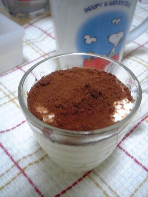 ティラミスバレンタインデーですから。ティラミスつくってみましたの、ほほほほほほマスカルポーネとヨーグルトをまぜまぜ生クリームよりちょっとカロリーオフ・・・それってチョコとカンケーないじゃんって思ってない?ほら!上にかかってるココア!これはまぎれもなくチョコの元!ね、えらいでしょ、うさこ