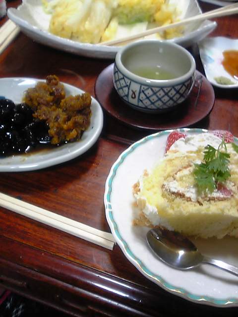 そしてこれは郷土料理の数々です手前にあるのは太郎庵ていうお菓子の蔵のロールケーキです