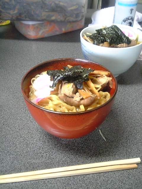 そうです、実家では元旦はお雑煮をたべますが二日目は年越しそばで作った鶏ガラスープの、ラーメンをいただくのですこれがまた・・・