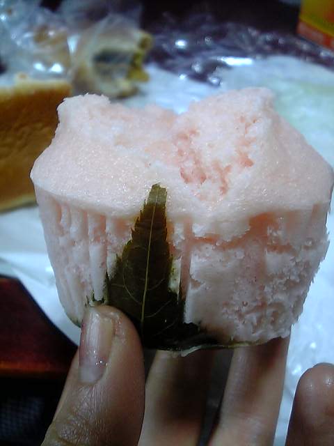 さくらの葉っぱと桜色の蒸しパン。中はあんこがはいってるの