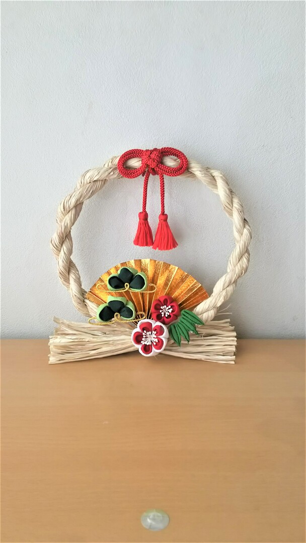 つまみ細工で梅や松を作り、注連縄のリースに飾ります。