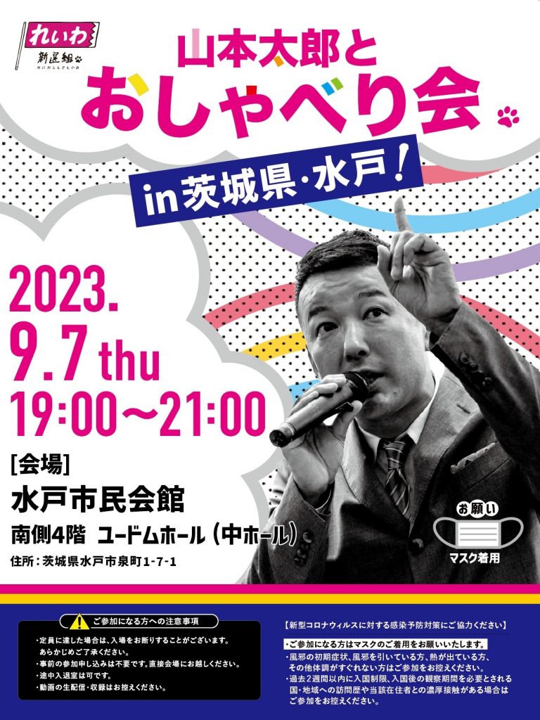 【山本太郎とおしゃべり会 in 茨城県・水戸市!】2023年9月7日(木) 19:00~21:00 | れいわ新選組【山本太郎とおしゃべり会 in 茨城県・水戸市!】 日時:2023年9月7日(木) 19:00~21:00会場:水戸市民会館 南側4階 ユードムホール (中ホール)住所:茨城県水戸市泉町1-7-1WEB:https://www.mito-hall.jp/access/⚠️会場へのお問合せはお控えください。 ◇◇◇お願いなど◇◇◇・参加される方はマスクのご着用…reiwa-shinsengumi.com