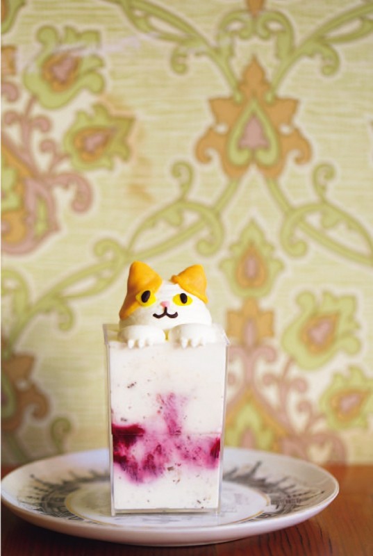 立体のにゃらんが顔を出すバニラムース!? ちょこんと出した猫の手が可愛すぎて、このまま飾っておきたいくらいのスイーツ。