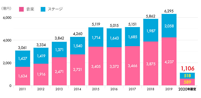 ライブ・エンタテインメント白書によると2020年の音楽ライブの市場規模は86.1%減とのことであり、およそ7分の1になったことになります。