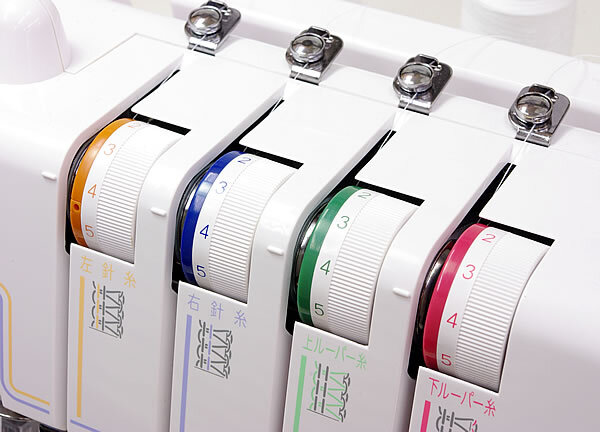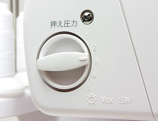 もう一つ、特徴的なのは押さえ圧調整が5段階ダイヤルメモリ式(ロックミシンの大半の機種はメモリが付いていない)なので、布の厚さによって押さえ圧調整を行うことで、仕上がりをキレイにします。