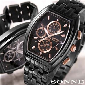 SONNE(ゾンネ) ブラックク 販売価格¥10,290 ■ALLブラックケース、ベルトの全てをブラックで統一しているのが特徴。これほどまでに存在感、重厚感を感じさせる時計はそうないはずだ。ご存知のとおり、ALLブラックは過去に何度もHITアイテムがあるように、人気カラーリングになっている。■トノーが人気の秘密トノー… | |