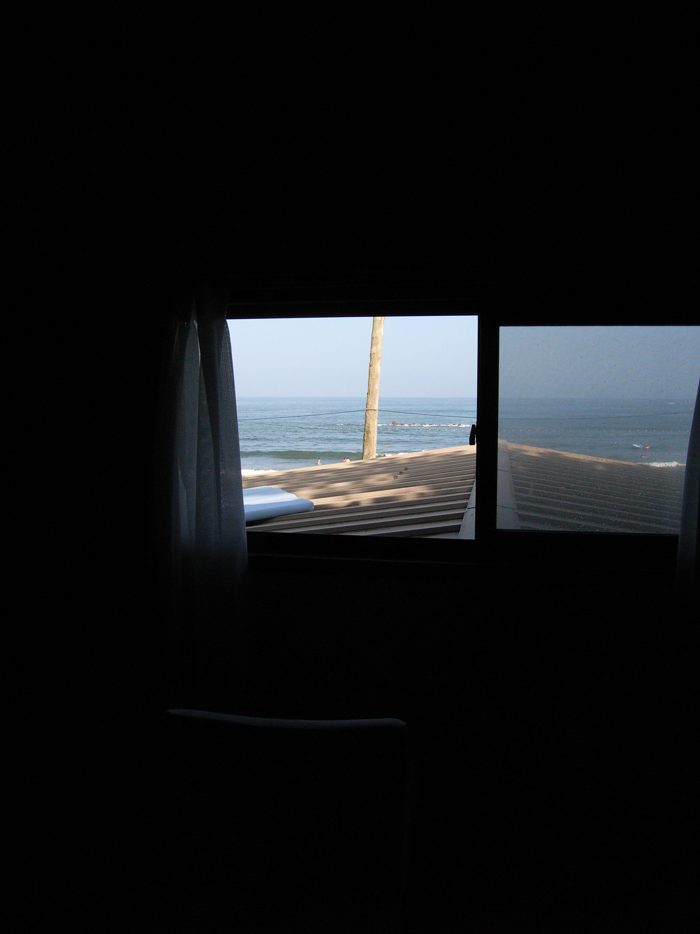 『窓から見る海』わが鴨川セカンド・ベース海楽庵二階奥の6畳間にある窓に合わせ船橋IKEAでかなりリーズナブルな73cmスツールを購入しおいてみた。