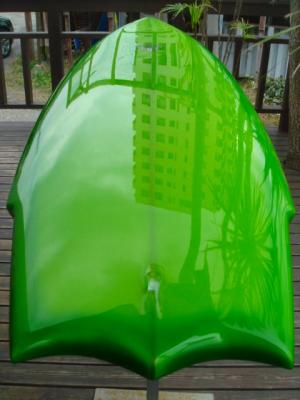 でもEPSの超軽いロングを数ヶ月前に購入したこともありその場はもちろん我慢、我慢、我慢。が、先日のオーストラリアNoosaトリップでヤスキヨの6フィート2インチ、フォーム材Komiシェイプ幅広ファンボードを借りてそのあまりにも早いテイクオフ、ハンディさに驚かされて以来、自分の心の中でドンドンこのティントの「グリーンバットマンクアッド」の存在が大きくなって成長していたのです。