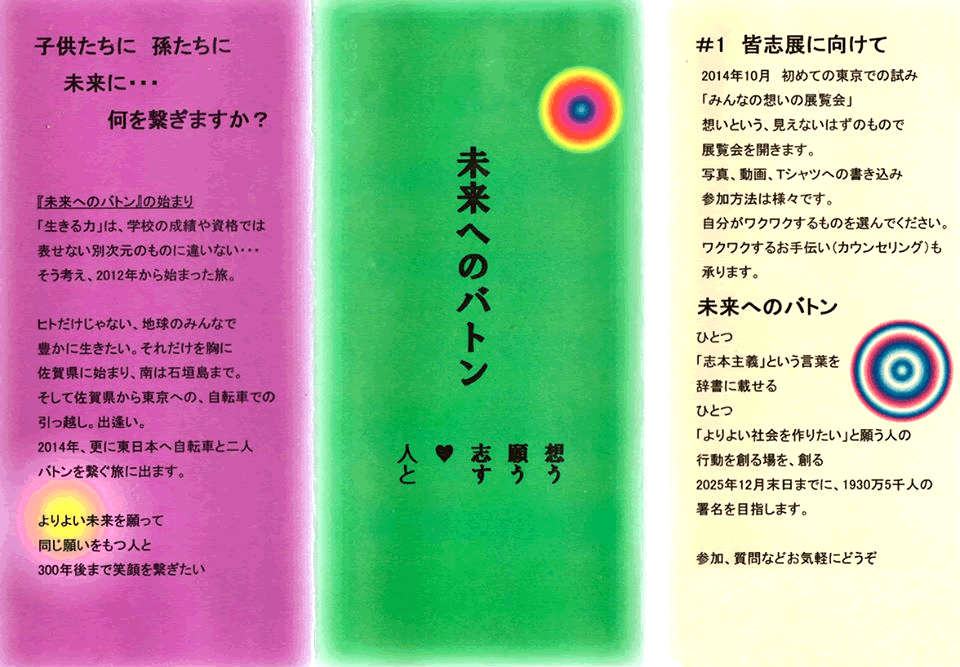 に共感し、自分も出来ることをやっていこう!同じ想いを持った人達との繋がりや内面世界を広げよう!など、「ひとりの生活者」としての切実な想いがあります!行動します!という決意表明です。バトンに①記録年月日 ②本名(所属の追記可) ③都道府県(出身地、現在地いづれでも)を記録します。