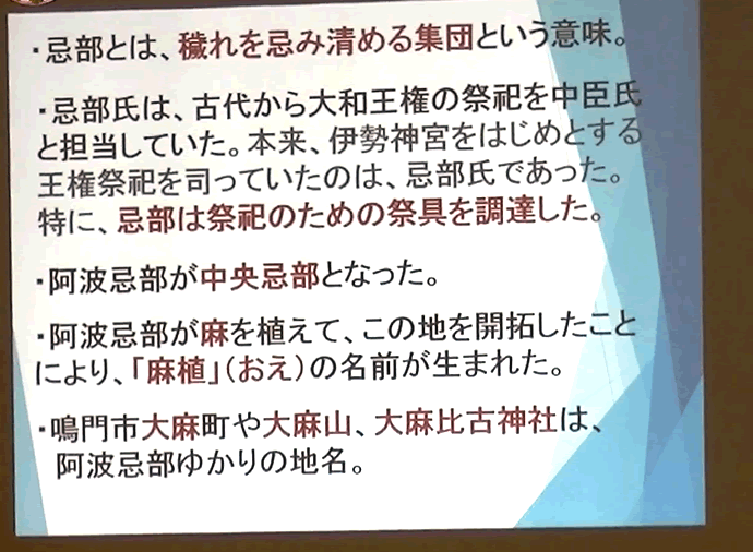 忌部氏は、古代から大和王権の祭祀を中臣氏と担当していた。本来、伊勢神宮をはじめとする王権祭祀を司っていたのは、忌部氏だった。特に、忌部は祭祀のための祭具を調達。