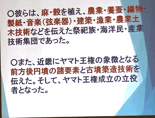 彼らは、麻・穀を植え、農業・養蚕・織物・製紙・音楽(弦楽器)・建築・漁業・農業土木技術を伝えた祭祀族、海洋民、産業技術集団であった。