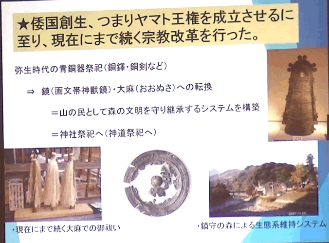 日本の農業のルーツは阿波忌部族がもつ古代農法にあるのではないかとの事で、衣食住全てを伝えていたのが阿波忌部族。それを現代に紐解くと「地方創生事業」の大本として展開したのが阿波忌部族であり、阿波忌部族が行っていた古代農法を知り、それが数千年もの間、伝統が絶えずに続き、継承されていた農法を知り、行う事が次の時代への新たな気づき、そして文化を継承し守り続ける大切さを知る事は阿波忌部を学ぶ事につながるであろうと。