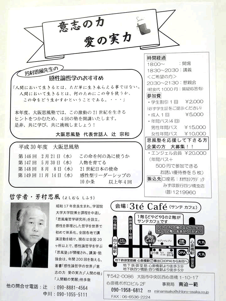 感性論哲学を仕事にどうを活かしていくか、生活や教育にどう活かすかを他の参加者の方の話や思風先生との質疑を通して考えていくための講座です。感性論哲学を学び、取り入れて自分の哲学として、実践を通して、「感性論哲学」を後世に伝えていく後継者の育成講座