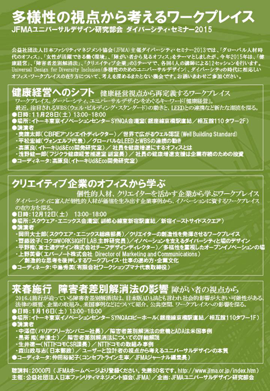 公益社団法人日本ファシリティマネジメント協会(JFMA)主催ダイバーシティ・セミナー2013では、「グローバル人材時代のオフィス」、「女性が活躍できる働く環境」、「障がい者から見るオフィス」をテーマとしましたが、今年2015年は、「健康経営」、「障害者差別解消法」、「クリエイティブ企業」の3テーマで、各回4人の講師による12セッションを行います。Universal Design for Diversity Inclusion(多様性のためのユニバーサルデザイン)、ダイバーシティの時代に相応しいオフィス・ワークプレイスの在り方について、考えを深めるまたとない機会です。お誘いあわせご参加ください。