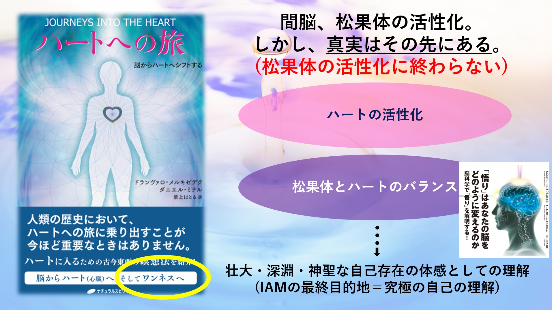 爬虫類脳とも呼ばれる脳幹(間脳)の上には、情緒・感情を司る大脳辺縁系があり、更にその上には知性を司る(しかし不完全な脳とも言われる)大脳新皮質が被さっています。間脳が活性化することにより、これらが本来のバランスを取り戻し、例えば新皮質における過剰な思考も不思議と静まってゆきます。IAMの中心であるあくび運動が悟りや至福体験と密接な繋がりがあるということはこうしたところにも起因しています。