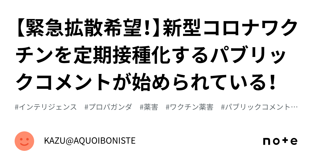 【緊急拡散希望!】新型コロナワクチンを定期接種化するパブリックコメントが始められている!|KAZU@AQUOIBONISTE人類史上最大の薬害被害を出し、世界中で問題になっている新型コロナワクチンを定期接種化という強制化を進めようと厚生労働省が、2024年3月9日23時59分を締め切りとして、パブリックコメントを募集している。 新型コロナワクチンと言えば、感染予防効果はないことが明らかとなり、重症化予防効果が期待できるだけで本当に効果があるかは一切調べられていない状況であり、メ…note.com